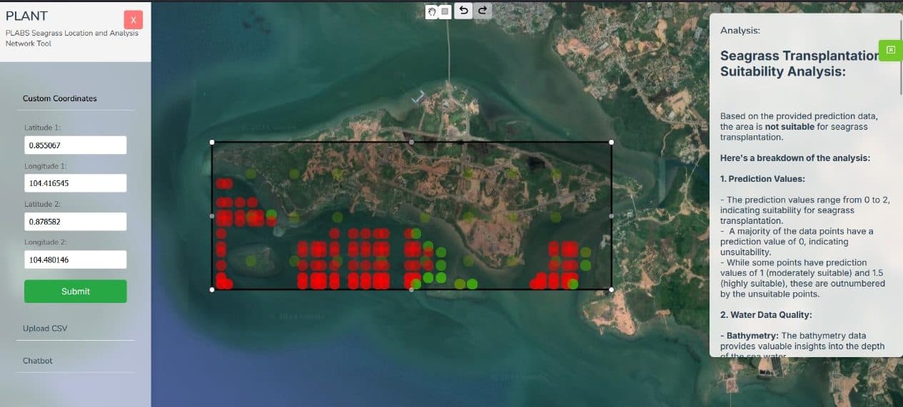 したがって、アプリケーションはPLANT(PLABS Seagrass Location and Analysis Network Tool)であり、関心のある地域に基づいて海草移植サイトを自動的に検出できます。このアプリケーションは、検出された領域の分析も提供します。赤い円は、その地域が海草移植に適していないことを定義し、緑の円は、その地域が海草移植に適していることを定義します。分析により、0から2までの適切なスコアがわかります。これらの結果は、Bi-LSTMモデルが適切な海草移植部位の予測に有効であることを示しており、平均88.38%の精度を達成しました。